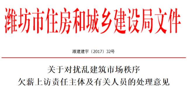 此前山东潍坊市住建局就对部分工程项目的责任主体或个人没有履行好责任,引发了多起欠薪上访案件,不同程度地扰乱了我市建筑市场秩序,影响了建筑行业和社会的和谐稳定,发布了《关于对扰乱建筑市场秩序欠薪上访责任主体及有关人员的处理意见》,其中共涉及了41家建筑企业及劳务分包企业、50名从业人员的不同处理意见。