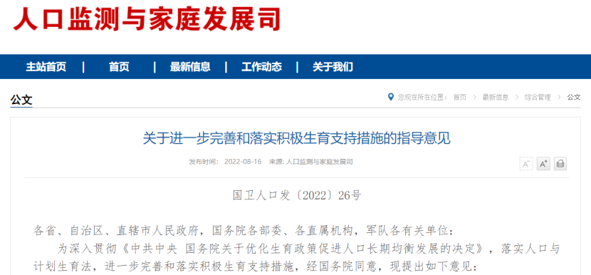 8月16日,卫健委等17个部门发布《关于进一步完善和落实积极生育支持措施的指导意见》。