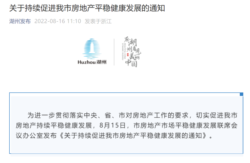 8月16日,“湖州发布”微信公众号发布《关于持续促进我市房地产平稳健康发展的通知》。其中提出降低预售申请条件、鼓励收购滞销房、加大风险项目处置力度、统筹项目间资金使用、因地制宜进行验收等五方面措施。